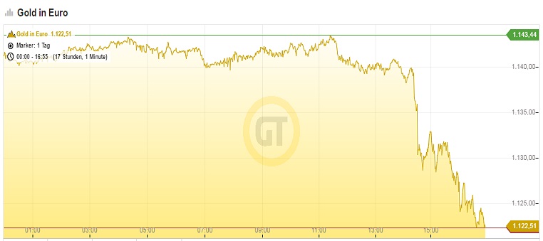 Nachdem der Goldpreis gegen 14:20 Uhr die Schwelle von $ 1.300 unterschritten hatte, folgten Anschlussverkäufe, die die Notierung bis 17:45 Uhr auf $ 1.275 (€ 1.139) hinuntertrieben.