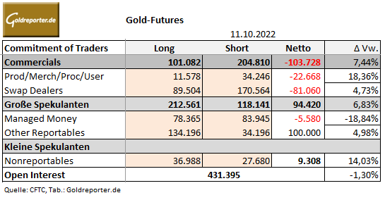 Das negative Momentum auf dem Goldmarkt hält an. Der Goldpreis rutschte vergangene Woche erneut unter die Marke von 1.700 US-Dollar – und zwar deutlich. Einmal mehr waren es die negativen Einflüsse und Erwartungen hinsichtlich der Zinsentwicklung in den USA, die die Kurse bewegten. Und am US-Terminmarkt verabschiedeten sich weitere Investoren aus dem Handel mit Gold-Futures. Wir betrachten dazu die jüngsten CoT-Daten mit den Positionen der größten Händlergruppen per 11. Oktober 2022.