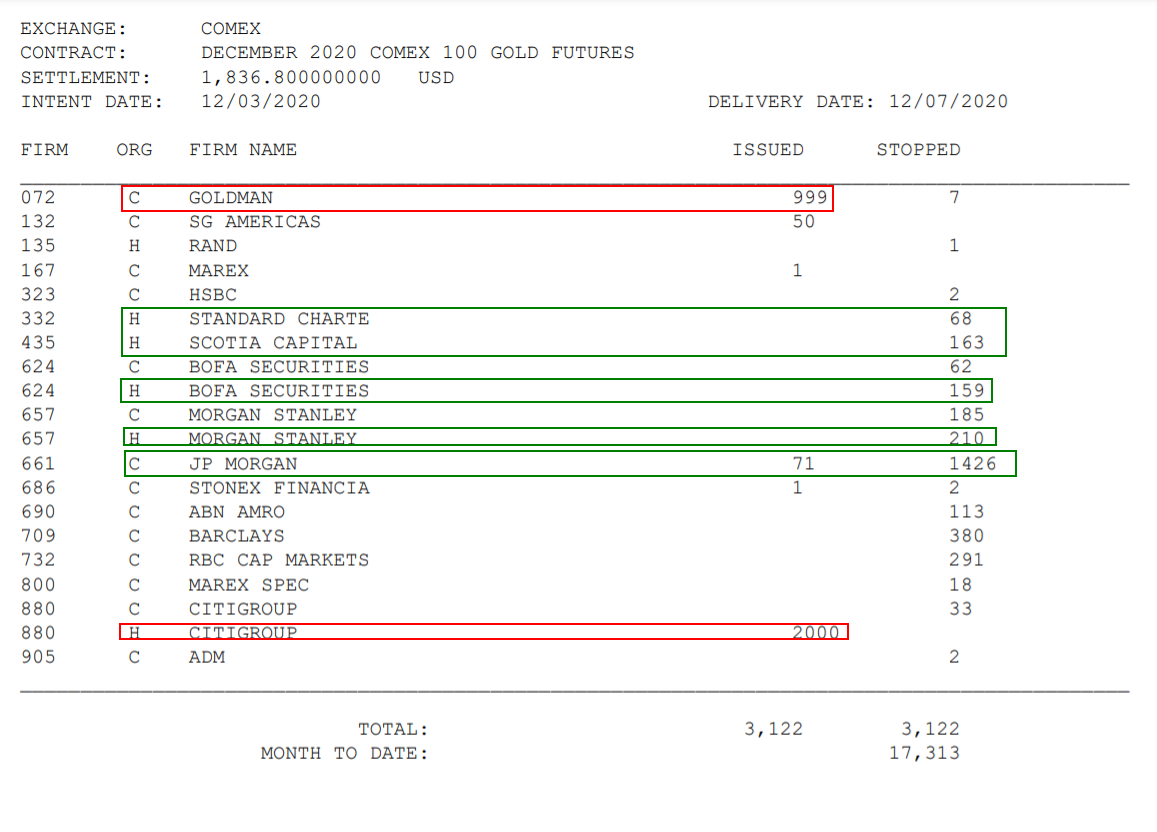 Interessant zu sehen, WER auf der „Verkäufer-Seite“ steht (Goldman, Citigroup) und WER ordentlich „einkauft“ (JP.Morgan, Morgan Stanley, Bank of America) (Weihnachtsgeschenke…), und das beim Kurs von 1836,- USD/Goldunze.