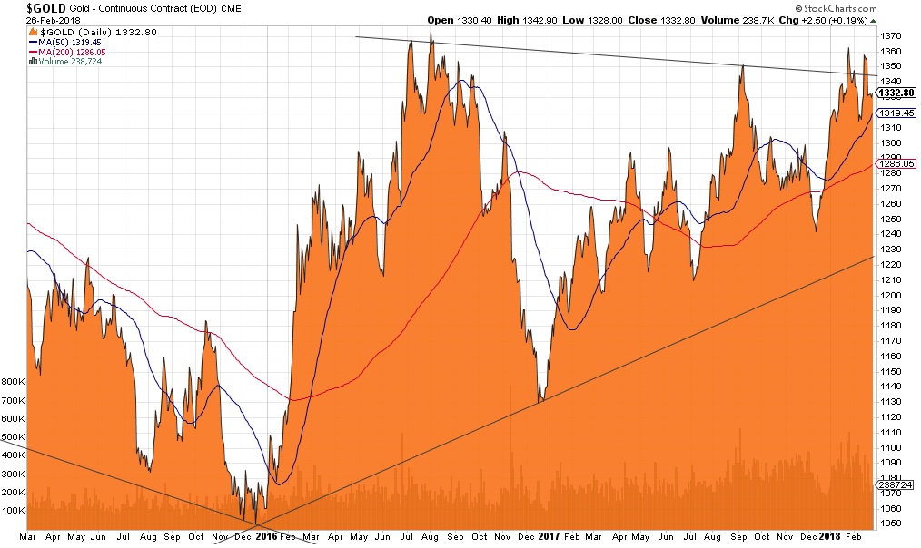 Goldpreis in US-Dollar, 2 Jahre (Quelle: Stockcharts.com). Ausbruch über $ 1.350 bislang nicht nachhaltig gelungen.
