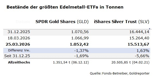 Die Verkaufstendenzen bei Gold und Silber spiegeln sich auch in den jüngsten Zahlen aus dem ETF-Sektor wider. Der weltweit größte Gold-ETF, SPDR Gold Shares (GLD), meldet per 25. März 2026 Goldbestände in Höhe von 1.052,42 Tonnen. Damit wanderten innerhalb einer Woche 14,57 Tonnen ab.