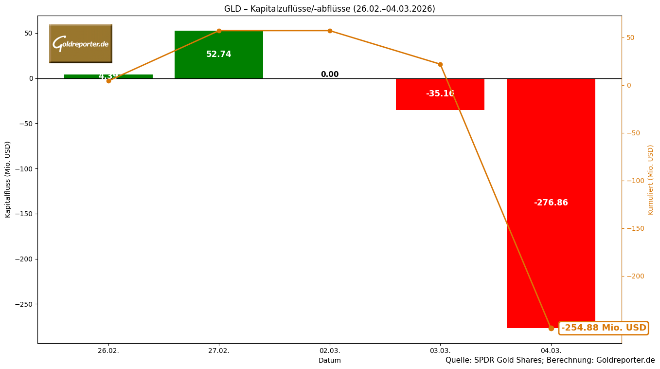 Kapitalbewegungen im Gold-ETF SPDR Gold Shares (GLD) vom 26. Februar bis 4. März 2026. Unter dem Strich ergibt sich ein Kapitalabfluss von rund 254,9 Millionen US-Dollar.
