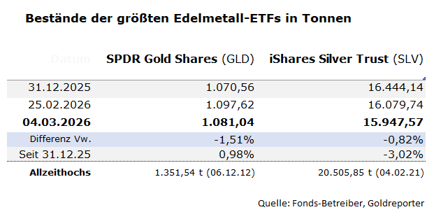 Auch beim weltweit größten Gold-ETF blieb der Handel von starken Bewegungen geprägt. Innerhalb der vergangenen fünf Handelstage gingen die Bestände des SPDR Gold Shares (GLD) um 16,58 Tonnen zurück. Das Inventar sank damit auf 1.081,04 Tonnen.