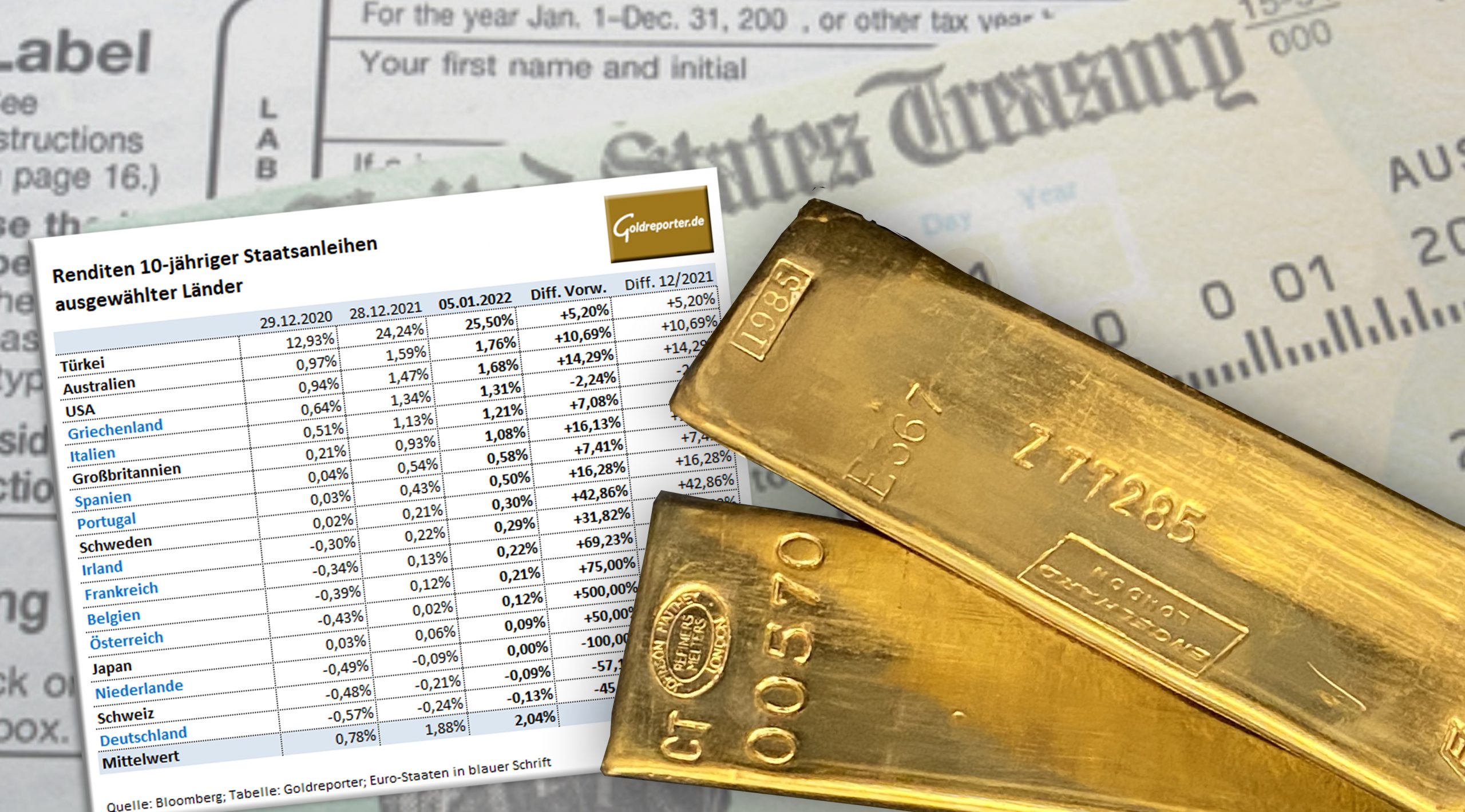 Die Renditen 10-jähriger Staatsanleihen sind in der ersten Handelswoche des neuen Jahres stark angestiegen. Der Goldpreis hält sich aber über 1.800 US-Dollar.