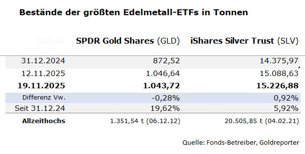 Gold- und Silberbestände GLD und SLV per 19. November 2025 und Veränderung gegenüber Vorwoche.