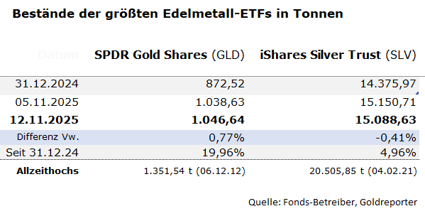 Seit Jahresbeginn zeigen die großen Edelmetall-ETFs deutliche Bestandssteigerungen. Beim SPDR Gold Shares stieg die hinterlegte Menge um 174 Tonnen, begleitet von Nettozuflüssen von 19,5 Milliarden US-Dollar. Beim SLV summieren sich die Zuwächse auf 712 Tonnen und etwa 960 Millionen US-Dollar Kapitalzuflüsse.