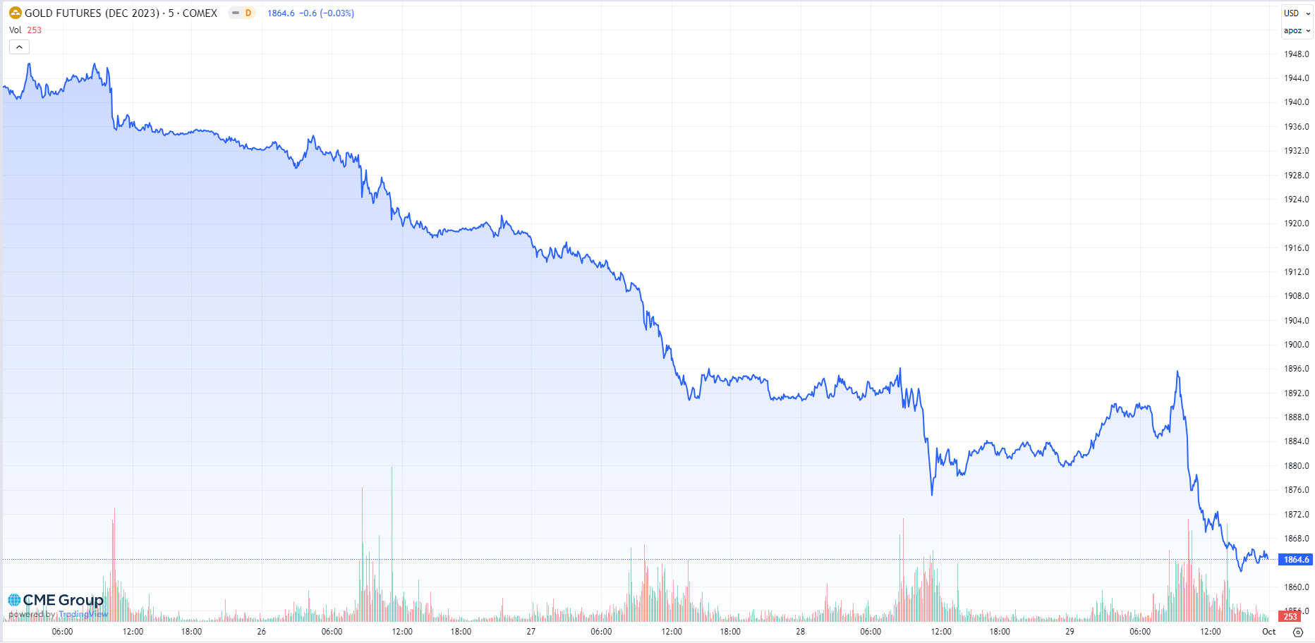 Die Handelswoche brachte eine kontinuierliche Abwärtsbegebung beim Goldpreis. Die kurze Erholung am Freitag wurde erneut abverkauft. So ging Gold auf Basis der US-Futures (Dezember-Kontrakt) mit 1.864 US-Dollar pro Unze ins Wochenende. Dabei ergibt sich gegenüber Vorwoche ein Kursverlust von 4,1 Prozent oder 79 US-Dollar. Und das entspricht dem größten Wochenverlust seit dem 18. Juni 2021. Damals waren es minus 5,9 Prozent.