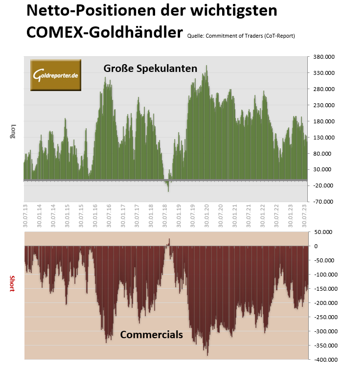Hier ist die Netto-Short-Position der „Commercials“ gegenüber Vorwoche um fast 12 Prozent gesunken auf 134.836 Kontrakte. Damit standen diese kommerziellen Händler unter dem Strich mit 419 Tonnen Gold auf der Verkaufsseite (Vorwoche: 475 Tonnen).