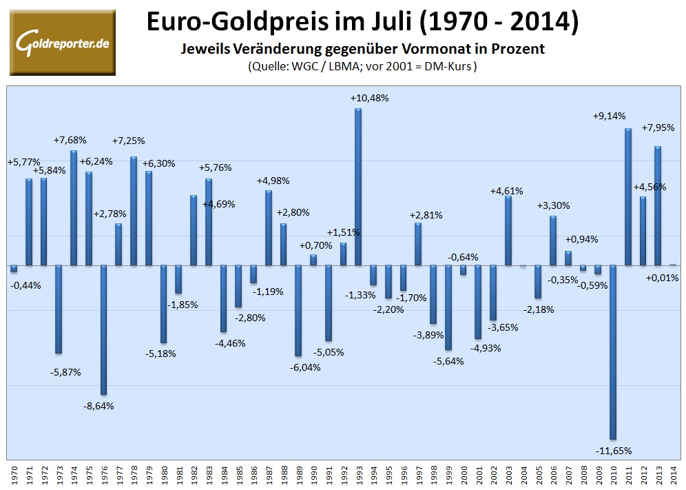 Im Durchschnitt endete der Juli mit einem Kursplus von 0,57 Prozent. In 22 von 45 Jahren sprang ein Kursgewinn heraus. In den vergangenen vier Jahren schnitt der Euro-Goldpreis in diesem Monat positiv ab.