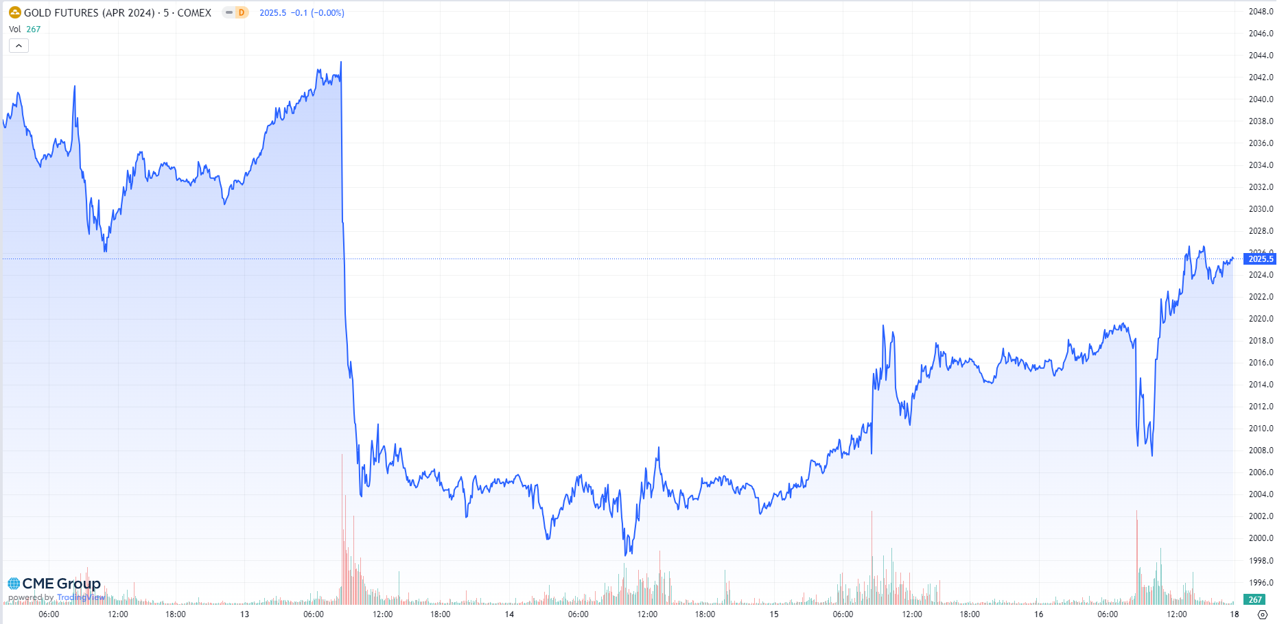 Am vergangenen Dienstag brach der Goldpreis nach Bekanntgabe der jüngsten US-Inflationsdaten im US-Futures-Handel in kurzer Zeit um 40 US-Dollar auf Kurse knapp oberhalb von 2.000 US-Dollar ein (April-Kontrakt). Am Mittwoch ging es dann kurzzeitig unter diese Schwelle. Allerdings erholte sich Gold dann bis zum Wochenende wieder schrittweise und beendete den Handel am Freitag mit 2.025,50 US-Dollar. Damit ergibt sich gegenüber Vorwoche ein Kursrückgang von 0,6 Prozent.