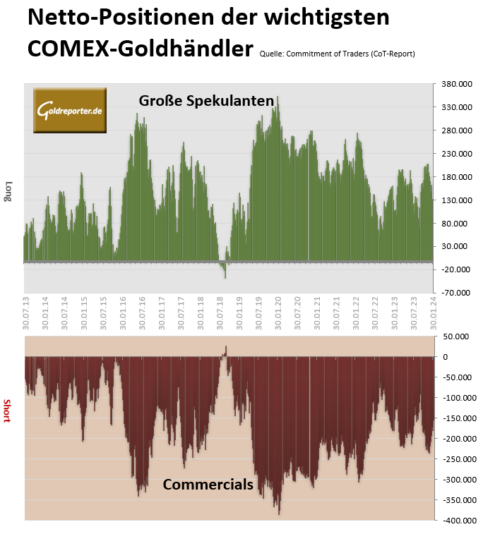 Dazu betrachten wir zunächst die aktuellen CoT-Daten mit den Positionen der größten Händlergruppen im Geschäft mit Gold-Futures per 16. Februar 2024.