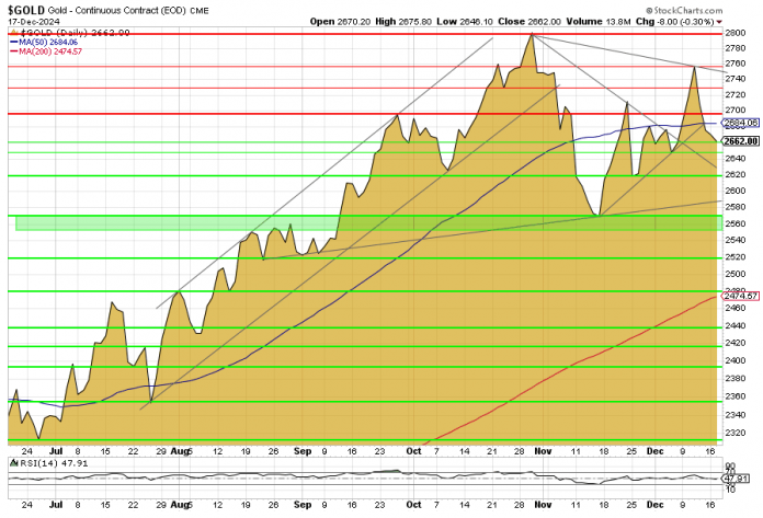 Am gestrigen Dienstag schloss der Preis für die Feinunze Gold auf der Basis der US-Futures (Februar-Kontrakt) mit 2.662 US-Dollar pro Unze. Das entsprach 2.536 Euro. Damit kam der Goldpreis wieder etwas unter Druck. Denn gegenüber der Vorwoche verzeichneten die Notierungen Kursverluste von 2,0 Prozent (USD) bzw. 1,7 Prozent (EUR). Somit wurde der Kursanstieg der Vorwoche wieder vollständig ausgeglichen. Wir werfen einen Blick auf die technischen Rahmenbedingungen per 17. Dezember 2024.