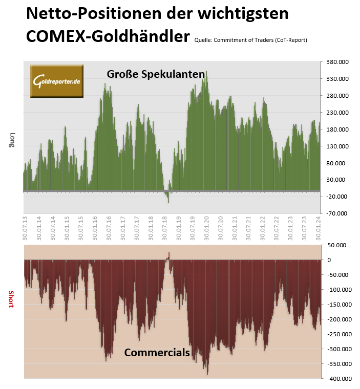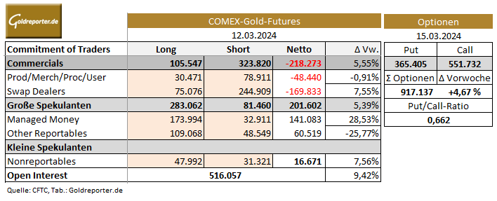 Was geschah vergangene Woche am US-Terminmarkt? Dazu betrachten wir zunächst die jüngsten CoT-Daten mit den Positionen der größten Händlergruppen im Geschäft mit Gold-Futures per 12. März 2024. Hier sehen wir einen weiteren Anstieg der Netto-Short-Position in den Händen der „Commercials“ um 5 Prozent auf 218.273 Kontrakte.