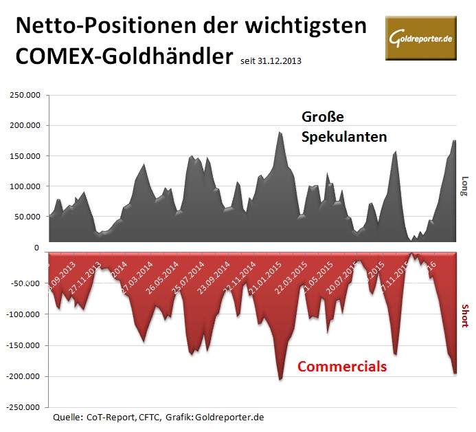 Die Netto-Short-Position der „Commercials“ stieg per 8. März 2016 noch einmal um knapp 14 Prozent auf 195.372 (Futures-)Kontrakte. Es ist die größte Verkaufsposition dieser kommerziellen Händler seit dem 3. Februar 2015. Die Untergruppe der „Swap Dealers“ (darunter die Großbanken) war zum gleichen Zeitpunkt mit 69.385 Kontrakten netto-short (+18 %).