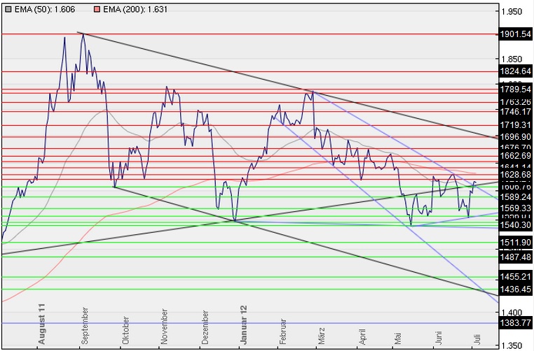 Der Goldchart hat in diesem Umfeld wichtiges Terrain gutgemacht. Wie die Chart-Abbildung oben zeigt, kehrte Gold erneut in die symmetrische Dreiecksformation zurück (schwarz). Die Chartlinie durchbrach den fallenden 4-Monats-Trend nach oben und steht aktuell oberhalb des 50-Tage-Durchschnitts (1.606 Dollar). Zur 200-Tage-Line (1.631 Dollar) besteht nur noch ein Abstand von 0,9 Prozent.