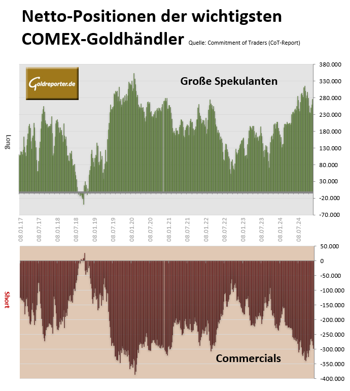 Allerdings sank der Open Interest bis zum Handelsschluss am Freitag wieder um 1 Prozent auf 478.156 Kontrakte. Gegenüber Vorwoche (Freitag bis Freitag) stieg die Anzahl der Gold-Futures-Verträge aber um 2 Prozent.