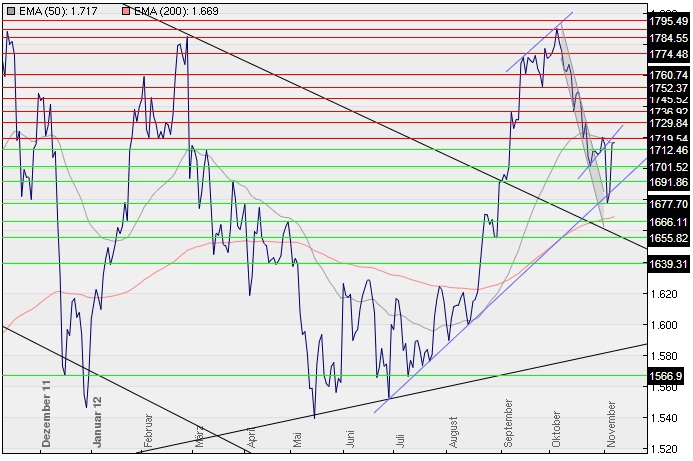 So lauten die aktuellen kurzfristigen Unterstützungen nun erneut 1.712 Dollar und 1.701 Dollar. Mit Schlusskursen oberhalb von 1.719 Dollar könnte der Chart die in der vergangenen Woche begonnene Erholung fortsetzen und die Bodenbildung bestätigen, auf die wir seit dem Kursrückgang nach Erreichen des Zwischenhochs Anfang Oktober gewartet haben.