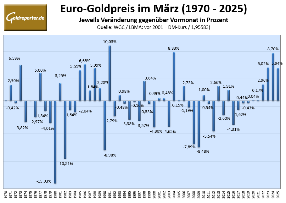 März gilt in der Langzeitstatistik als schwacher Goldmonat, liefert aber regelmäßig die größten Ausschläge – nach oben wie nach unten.