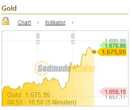 Der Goldpreis zog allerdings erst nach Eröffnung des US-Terminmarktes kurz nach 14 Uhr deutlich an. Das ist auch auf positive charttechnische Effekte zurückzuführen. Vom Tagestief bei 1.659 Dollar (Deutsche-Bank-Indikation) stieg der Kurs des Edelmetalls zunächst bis auf 1.670 Dollar. In einem zweiten Aufwärtsschwung nach 15:30 Uhr kletterte der Goldpreis weiter auf Kurse knapp oberhalb von 1.675 Dollar (1.268 Euro). Da auch der US-Dollar um mehr als 1 Prozent anzog, konnte der Euro-Goldpreis kaum Boden gut machen