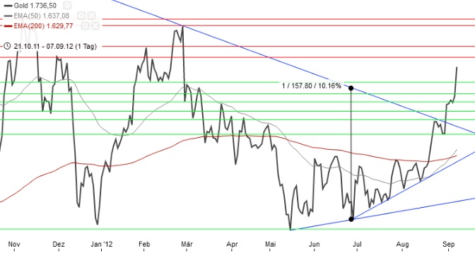 Der Goldpreis beendete die vergangene Handelswoche bei 1.736,50 US-Dollar (Deutsche-Bank-Indikation). Der starke Kursanstieg am Freitag bestätigte den Ausbruch des Goldcharts aus dem 12-monatigen Abwärtstrends sowie aus einer symmetrischen Dreiecksformation.