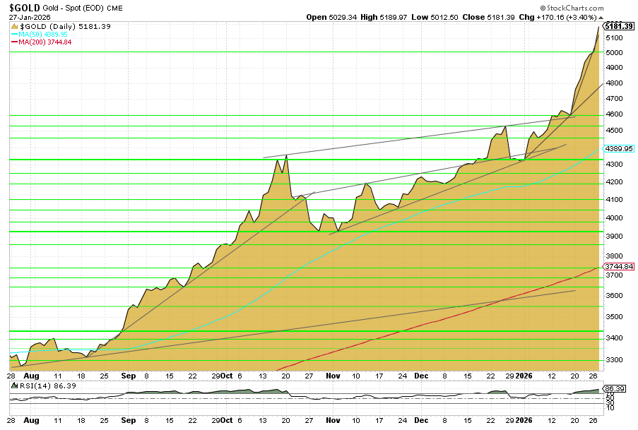 Der Goldpreis setzt seine dynamische Aufwärtsbewegung fort. Zum Handelsschluss notierte das Edelmetall (CME Spot) bei 5.181 US-Dollar je Unze. Damit markierte Gold ein neues Rekordhoch. Auf Wochensicht ergibt sich ein Anstieg von 9 Prozent. Seit Jahresbeginn beläuft sich das Plus auf rund 20 Prozent.