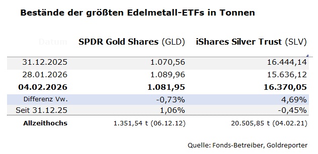 Die Korrektur am Goldmarkt ging mit merklichen Abflüssen aus dem größten Gold-ETF einher. Der SPDR Gold Shares (GLD) wies per 4. Februar 2026 ein physisches Inventar von 1.081,95 Tonnen aus. Innerhalb von fünf Handelstagen verringerte sich der Bestand damit um 8,01 Tonnen. Parallel dazu zog Kapital ab: Per Saldo flossen rund 279 Millionen US-Dollar aus dem Fonds.