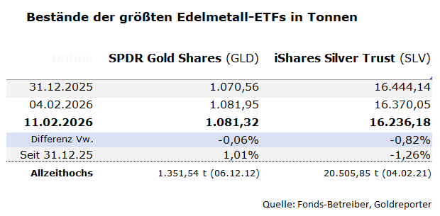 Die Kapitalströme der Edelmetall-ETFs gelten als wichtiger Stimmungsindikator. Abflüsse werden häufig mit Gewinnmitnahmen oder taktischen Positionsreduzierungen in Verbindung gebracht, während Zuflüsse eher auf strategische Allokationen hindeuten.