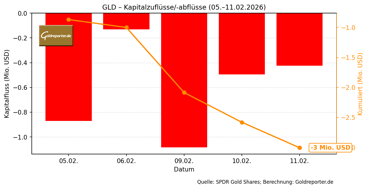 Beim weltweit größten Gold-ETF zeigte sich zuletzt nur geringe Dynamik. Der SPDR Gold Shares (GLD) verzeichnete innerhalb der vergangenen fünf Handelstage Netto-Entnahmen von insgesamt 3 Millionen US-Dollar. Parallel dazu sank die gemeldete Lagermenge um 0,63 Tonnen auf 1.081,32 Tonnen.