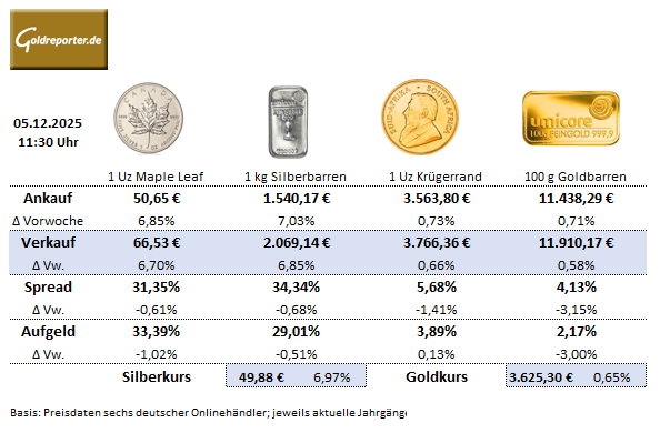 Preisdaten vom 5. Dezember 2025: Durchschnittswerte deutscher Edelmetallhändler für Krügerrand, Maple Leaf, Silberbarren und Goldbarren.