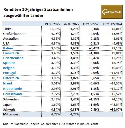 Wie haben sich die Marktzinsen entwickelt? Am Dienstagmittag rentierten 10-jährige US-Staatsanleihen mit 4,31 Prozent und damit leicht unter dem Wert der Vorwoche. Auch die europäischen Renditen sind zumeist minimal rückläufig (siehe Tabelle). So lagen die entsprechenden Marktzinsen für deutsche Papiere zuletzt bei 2,73 Prozent – nach 2,77 Prozent in der Vorwoche. Am Freitag wird die deutsche Inflationsrate für den Monat August bekanntgegeben.