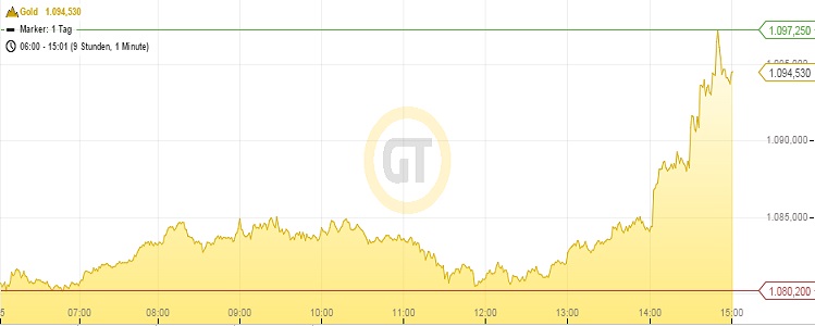 Der Goldpreis zog am heutigen Freitagnachmittag deutlich an, nachdem wichtige Wirtschaftszahlen aus den USA veröffentlicht wurden. Um 15 Uhr kostete die Feinunze Gold 1.094 US-Dollar. Das entsprach 998 Euro. Am Vormittag wurden am Spotmarkt noch Kurse von 1.080 US-Dollar notiert (989 Euro).