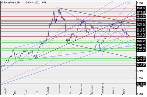 Zweitens: in Ihrem Linienwirrarr wird die über drei Zeitperioden nach September 2011 sichtbare Parallelität nicht deutlich: http://www.deutschland-debatte.de/wp-content/uploads/2012/03/goldpreise-2-Jahre-2-16.3.2012.jpg. Die wirkliche Gefahr geht jedoch von der unteren Linie des Abwärts- Trendkanals aus. Die dürfte vielleicht Mitte April ( nicht Anfang April ) erreicht sein. Irgendwelche anderen Linien da einzuziehen halte ich für nicht sinnvoll oder aus der Systematik der Chartanalyse ableitbar.