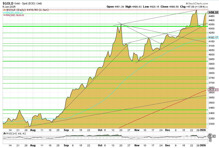 Am Dienstag schloss der Goldpreis im US-Futures-Handel (Januar-Kontrakt) mit 4.498 US-Dollar pro Unze. Damit stand der Kurs nur noch 0,8 Prozent unter dem Rekordhoch vom 26. Dezember. Gegenüber der Vorwoche stieg Gold um 3,7 Prozent. In der Vorwoche war der Kurs noch um 3,4 Prozent gefallen.