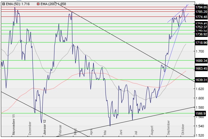 Der Widerstand bei 1.790 Dollar konnte auf Tagesschlussbasis nicht überwunden werden. Es folgte der Rücksetzer. Der Goldchart erhält nun kurzfristig Unterstützung in einem Bereich zwischen $ 1.752 und $ 1.760. Vor allem das letztgenannte Niveau (Zwischenhoch vom 2. Februar 2012) erscheint zunächst solide. In dieser Region drehte der Goldpreis bereits Ende September wieder nach oben.