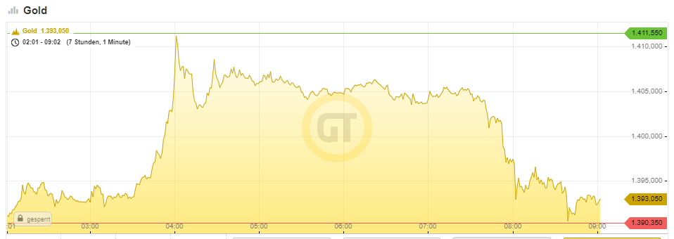 Am heutigen Vormittag um 9 Uhr kostete die Feinunze Gold am Spotmarkt 1.393 US-Dollar pro Unze (+0,42 Prozent). Das entsprach 1.235 Euro. Im Asienhandel wurden in der Nacht bereits Kurse von 1.411 US-Dollar erreicht (siehe Goldpreis-Grafik oben). Während Gold also weiter zulegte, gab Silber gegenüber Vortag um 0,7 Prozent nach auf 15,33 US-Dollar (13,59 Euro). Gold-Silber-Ratio liegt damit weiterhin bei einem extrem hohen Wert von 90.86.