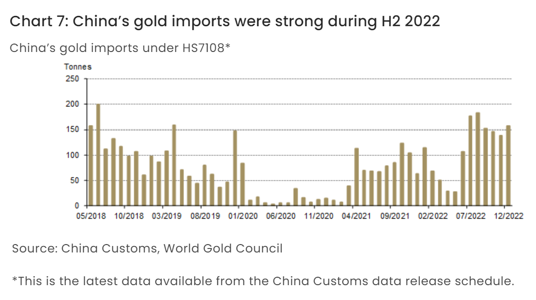 China hat im vergangenen Jahr so viel Gold importiert wie seit 2018 nicht mehr. Alleine im Dezember waren es laut WGC 157 Tonnen.