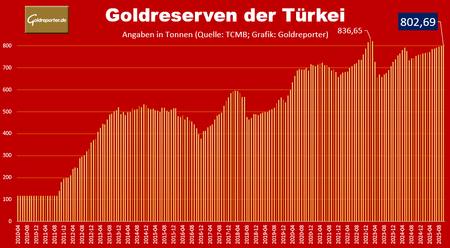 Die türkischen Goldreserven haben zum Monatsende Oktober 2025 einen Wert von 107,4 Milliarden US-Dollar erreicht. Der Anstieg ist vor allem dem deutlich höheren Goldpreis zu verdanken.