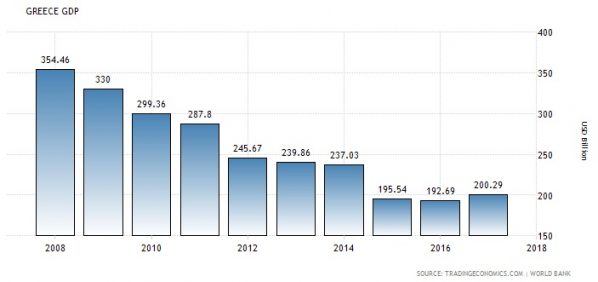 289 Milliarden Euro hat Griechenland in den vergangenen acht Jahren als Finanzhilfe erhalten. Es wurde gespart und gekürzt. Nun ist das dritte Rettungspaket ausgelaufen und Athen muss sich künftig wieder alleine am Kapitalmarkt finanzieren. Immerhin konnte man nun sechs Quartale in Folge ein Wirtschaftswachstum vermelden. Mit 0,2 Prozent fiel es zuletzt aber wieder schwächer aus als erwartet. Die EU-Kommission prognostizierte für das Gesamtjahr 2018 unlängst ein Plus von 1,90 Prozent. Nun ist fraglich, ob diese Zahl noch haltbar ist. In absoluten Zahlen sieht es ohnehin weiter mau aus. 2017 erzielte Griechenland ein Bruttoinlandsprodukt von 200,29 Milliarden Euro. Es lag weiterhin massive 56 Prozent unter dem Wert des Jahres 2008. Mehr