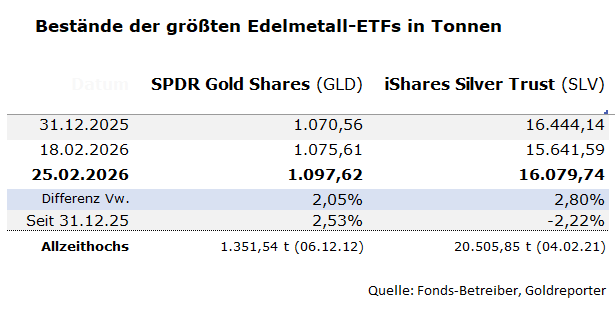 Auch der größte Silber-ETF verzeichnete innerhalb einer Woche eine starke Nachfrage. Denn die Bestände des iShares Silver Trust (SLV) stiegen im Zeitraum vom 19. bis 25. Februar 2026 um 438,15 Tonnen oder 2,8 Prozent auf 16.079,74 Tonnen.