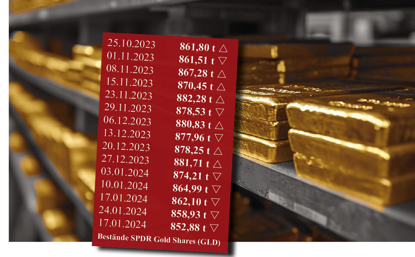 Keine positiven Impulse gab es im ETF-Bereich. Denn die Metall-Bestände des SPDR Gold Shares (Börsenkürzel: GLD) sanken nun fünf Wochen in Folge auf zuletzt 852,88 Tonnen. Damit verringerte sich das Inventar per 30. Januar 2024 um 6,05 Tonnen. Begleitet war die Bestandsminderung mit einem Nettokapitalabfluss in Höhe von 392 Millionen US-Dollar. Seit Jahresbeginn haben Investoren netto 1,6 Milliarden US-Dollar aus dem Fonds abgezogen.