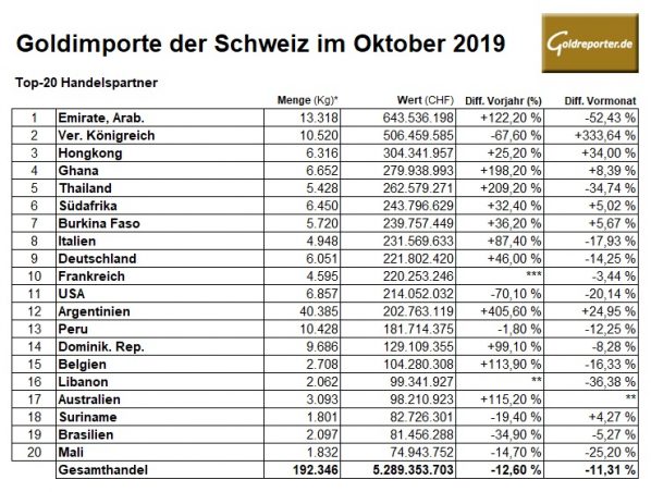 Den vierten Monat in Folge kommt das meiste Gold aus den Vereinigten Arabischen Emiraten in die Schweiz. Im Oktober waren es 13,1 Tonnen. Seit Juni 2019 haben die Emirate, vermutlich über den vorderasiatischen Hauptumschlagsplatz Dubai, bereits 110 Tonnen Gold geliefert. Aber auch aus Großbritannien kam mit 10,5 Tonnen erstmals seit vergangenem Juni wieder zweistellige Tonnagen. Allerdings fließt die größte Goldmenge zwischen UK und der Schweiz nach wie vor in die Gegenrichtung. Mehr dazu weiter unten. Aus Argentinien (40 Tonnen) und Peru (10 Tonnen) kam einmal mehr sehr viel Gold mit niedrigem Feingehalt.