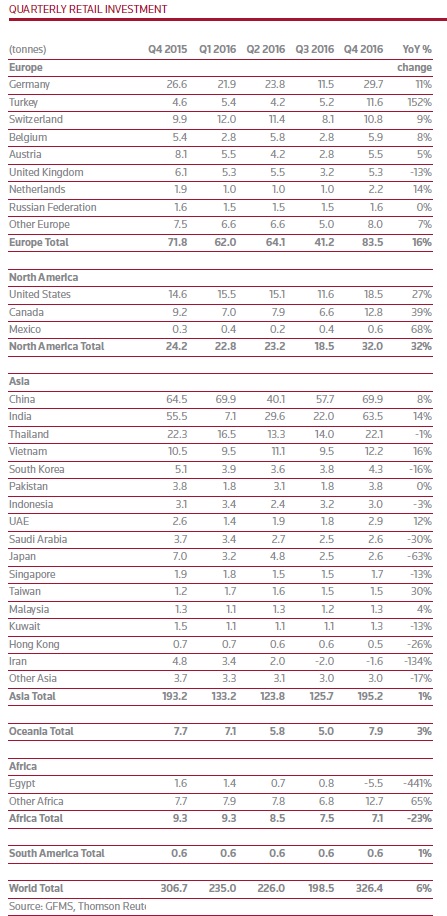 Goldnachfrage nach Ländern Q4 2016