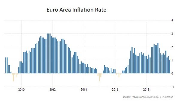 Die offizielle Inflation im Euroraum ist im Juli auf 1 Prozent gesunken. Die Euro-Inflationsrate ist damit auf den niedrigsten Wert seit November 2016 angekommen. Im Vormonat waren es noch 1,3 Prozent. Zu dem geringeren Anstieg beigetragen haben die zuletzt gesunkenen Energiepreise. So ist der Ölpreis (Brent Crude) in den vergangenen 12 Monate um 18 Prozent zurückgefallen. Mehr