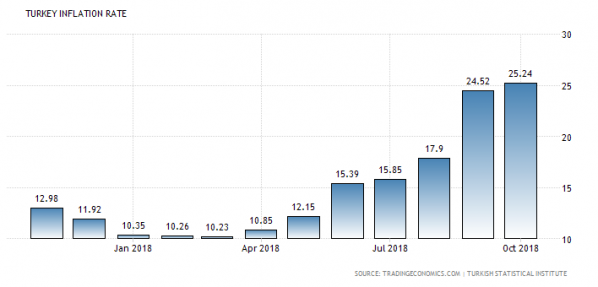 Am heutigen Montag wurde die offizielle Inflationsrate der Türkei für den Monat Oktober veröffentlicht. Demnach ist der Verbraucherpreisindex gegenüber Vorjahr um 25,24 Prozent geklettert. Es war der höchste Wert seit Juli 2003. Nach 24,52 Prozent im September stieg die offizielle Inflationsrate aber nicht mehr so dynamisch an wie noch in den Monaten zuvor. Zum Vergleich: Das Rekordhoch der Nachkriegszeit lag 138,71 Prozent im Mai 1980. Mehr