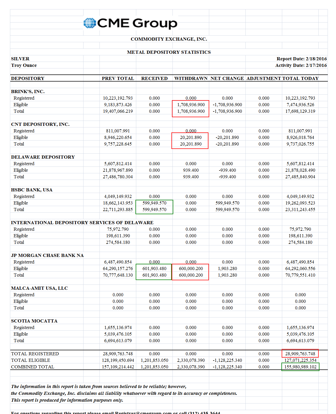 • Was übrigens noch auffällig ist: bei JPM kommen 600.000 Unzen Silber durch die Eingangstür („RECEIVED“) und verschwinden sofort durch die Ausgangstür („WITHDRAWN“).