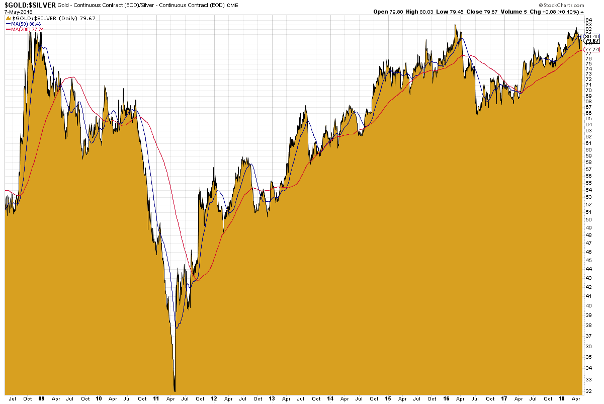 „Historisch gesehen ergibt sich eine niedrige Gold-Silber-Ratio oft auf dem Höhepunkt eines Bullenzyklus‘ und eine hohe Gold-Silber-Ratio ergibt sich immer wieder vor bedeutenden Anstiegen bei Gold und Silber. In den vergangenen 20 Jahren ereignete sich die Bodenbildung bei Silber immer dann, wenn die Ratio den Wert 80 erreichte“, sagt der Finanzexperte.