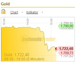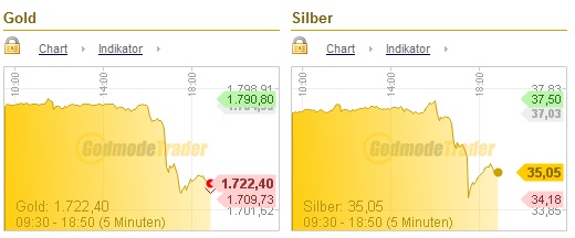 Ab 16 Uhr kam es dann zu mehreren Abverkaufswellen bei Gold und Silber. Innerhalb von nur 90 Minuten sackte der Goldpreis um 70 Dollar oder 4 Prozent von 1.785 Dollar auf 1.715 Dollar ab. Noch härter traf es Silber. Vom Tageshoch bei 37,40 Dollar kippte die Notierung intraday um mehr als 3 Dollar oder 8,5 Prozent auf 34,22 Dollar. Exakt um 17:30 Uhr erholten sich die Kurse wieder von ihren Tagestiefs.