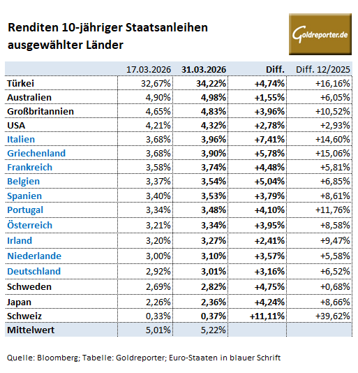 Anleiherenditen in den USA und Europa – Übersicht am 31. März 2026