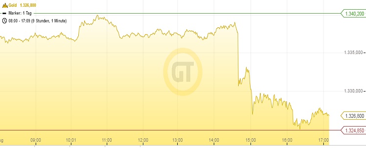 Im Tageshoch hatte die Goldunze auf dem Spotmarkt noch $ 1.340 gekostet (€ 1.188 Euro). Um 17:15 Uhr wurden 1.326 US-Dollar gezahlt (€ 1.179). Das Tagestief lag bei $ 1.324 (€ 1.177). Silber gab im Tagesverlauf zeitweise 2 Prozent ab und notierte am Nachmittag bei $ 18,58 (€ 16,51)