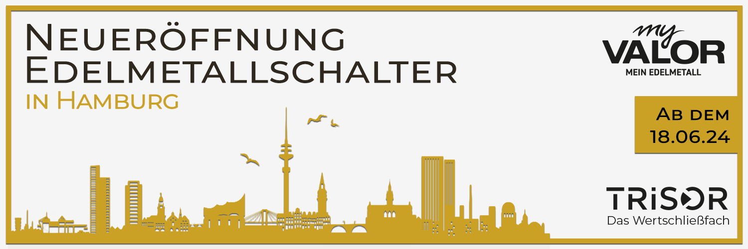 myVALOR und TRiSOR erweitern ihre Partnerschaft mit der Eröffnung eines neuen Edelmetall-Schalters am Hopfenmarkt 33 in Hamburg. Ab morgigen 18. Juni 2024 soll es losgehen. Der Standort bietet Kunden die Möglichkeit, Edelmetalle zu attraktiven Onlinepreisen zu kaufen und sicher in zertifizierten Tresoren von TRiSOR zu lagern. Die Öffnungszeiten: Montag bis Freitag, jeweils von 10 bis 18 Uhr. Mehr
